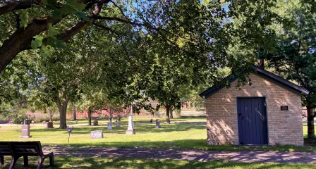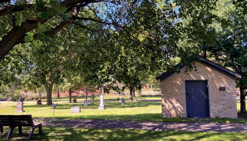 Walter and Marie Pederson, who lived next door to the City Cemetery at 103rd Street and Lyndale Avenue South, became the cemetery’s first caretakers in 1911. In winter, Walter would chisel out graves by hand to get below the frost line. Hot coals were left overnight in the uncompleted trench to thaw the ground. The brick structure shown here was built by residents and known as “the vault.” Once used to store the dead when the ground became too frozen to dig, it now serves as a tool storage shed.