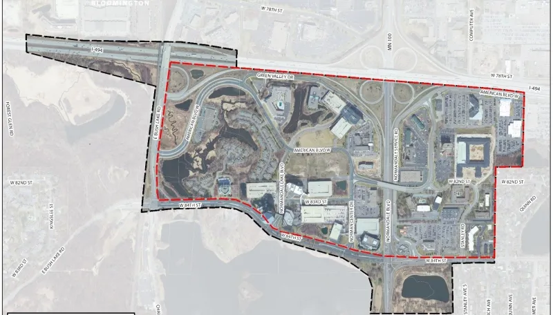 The Normandale Lake District Plan includes the area bounded by West 84th Street on the south, just beyond Stanley Road on the east, I-494 on the north and East Bush Lake Road on the west.